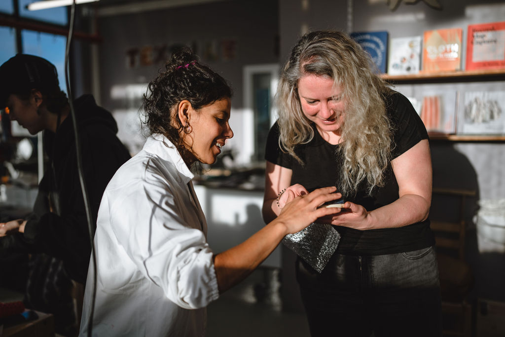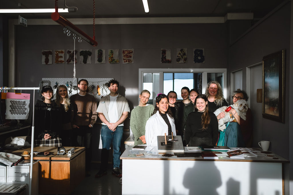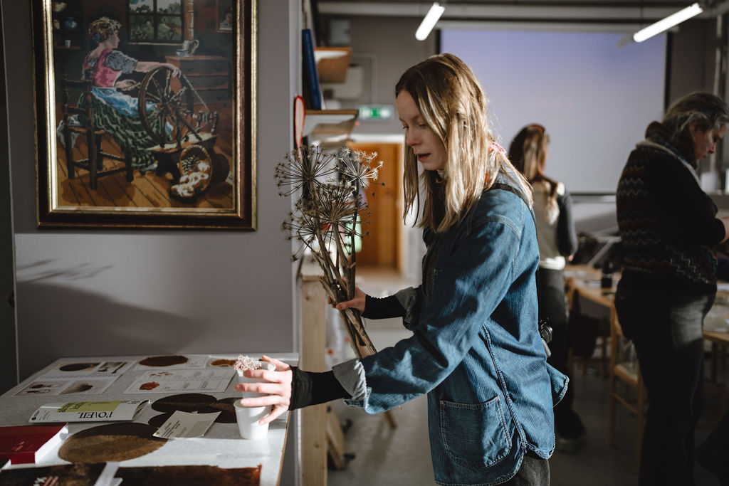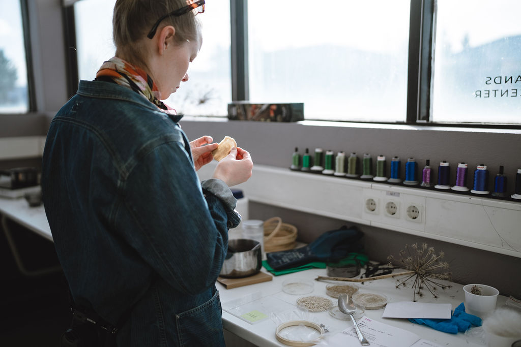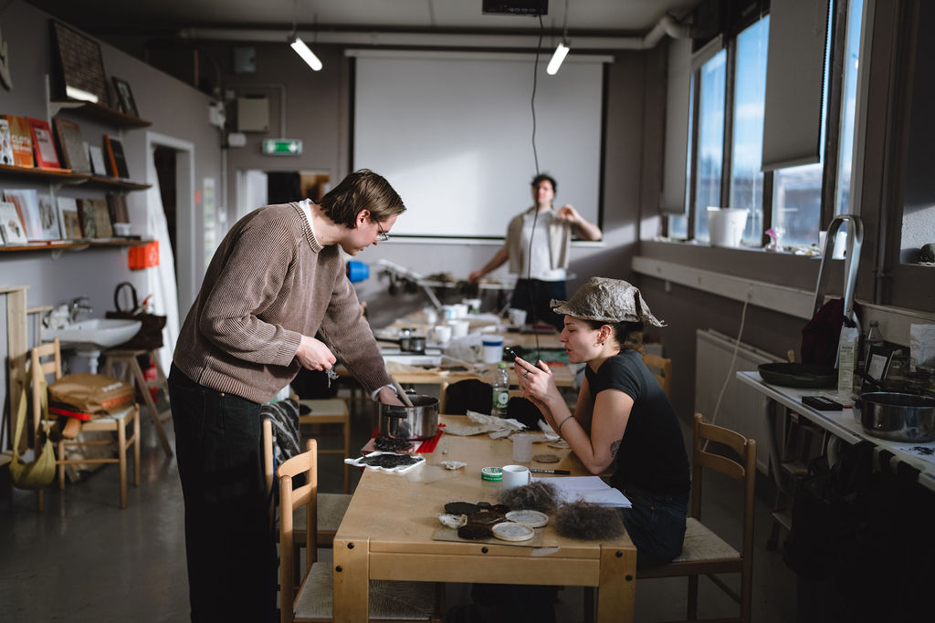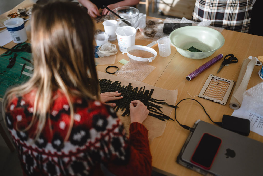 Back at the Textile Center, the group shifted into crafts and making. The focus was on biomaterials and bio-composites, experimenting with animal and vegetal biopolymers and combining them with seaweed, volcanic sand, Icelandic wool, and other locally abundant available resources.