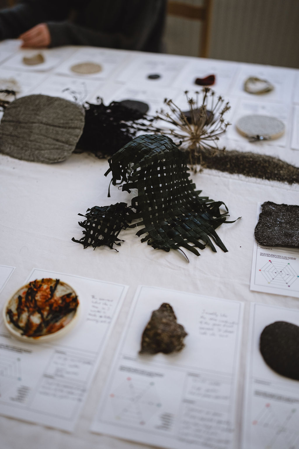 As experimentation progressed, the space became a shared studio-lab; tables filled with prototypes, notes, tools, seaweed traces, fibres, and evolving material families. Participants documented processes and outcomes throughout the workshop, capturing key steps, variations, and unexpected behaviours. This documentation is central to the Materials Dialogues approach; it supports knowledge exchange across communities and makes learning transferable beyond the moment of making.