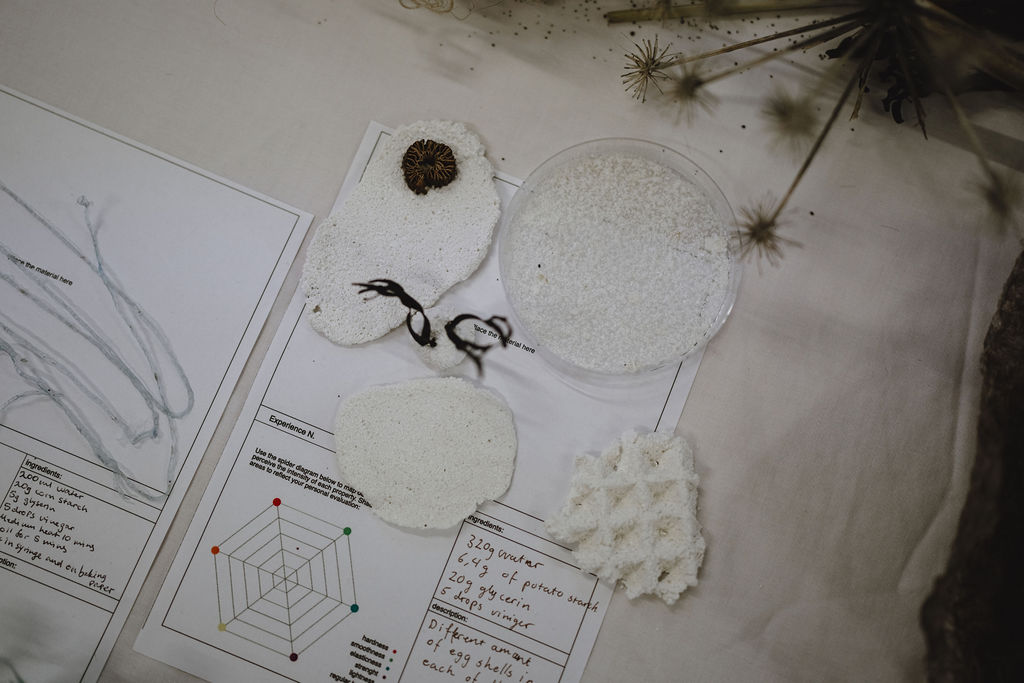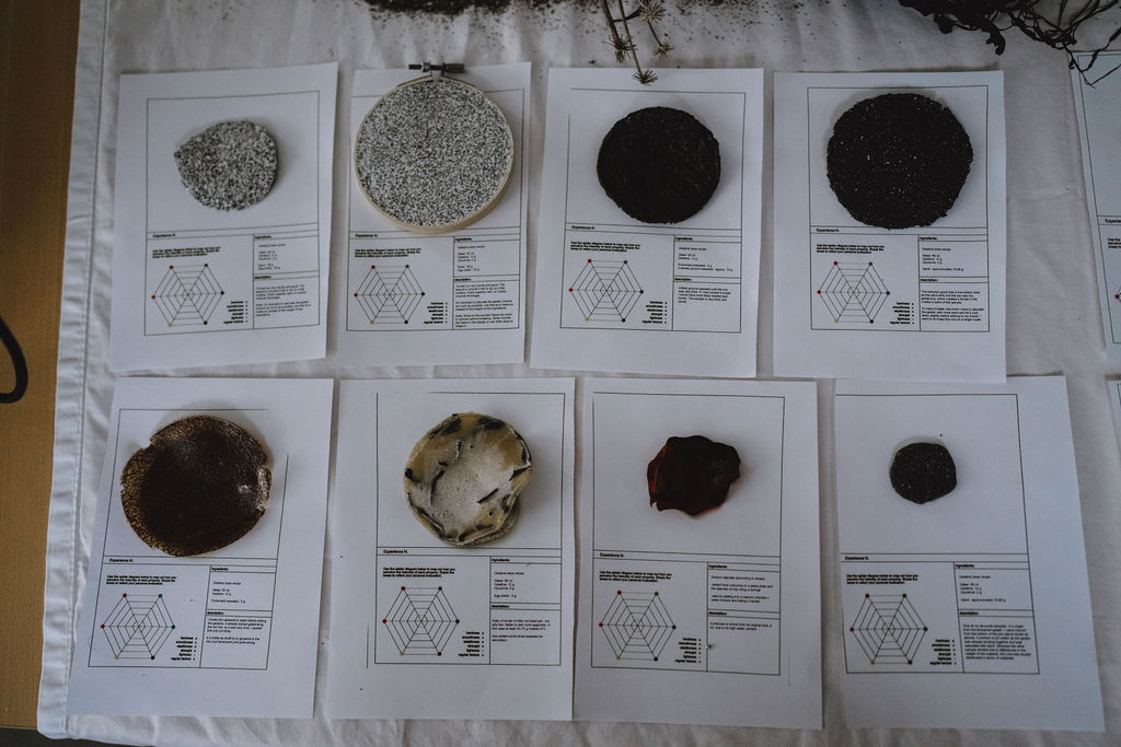 Using open “recipe” formats, participants developed mixtures, tested proportions, and observed how each ingredient influenced viscosity, drying behaviour, flexibility, strength, translucency, and colour. Each trial became both a material sample and a learning event, an opportunity to compare outcomes, exchange knowledge, and build shared vocabulary around what the materials were “doing.”
