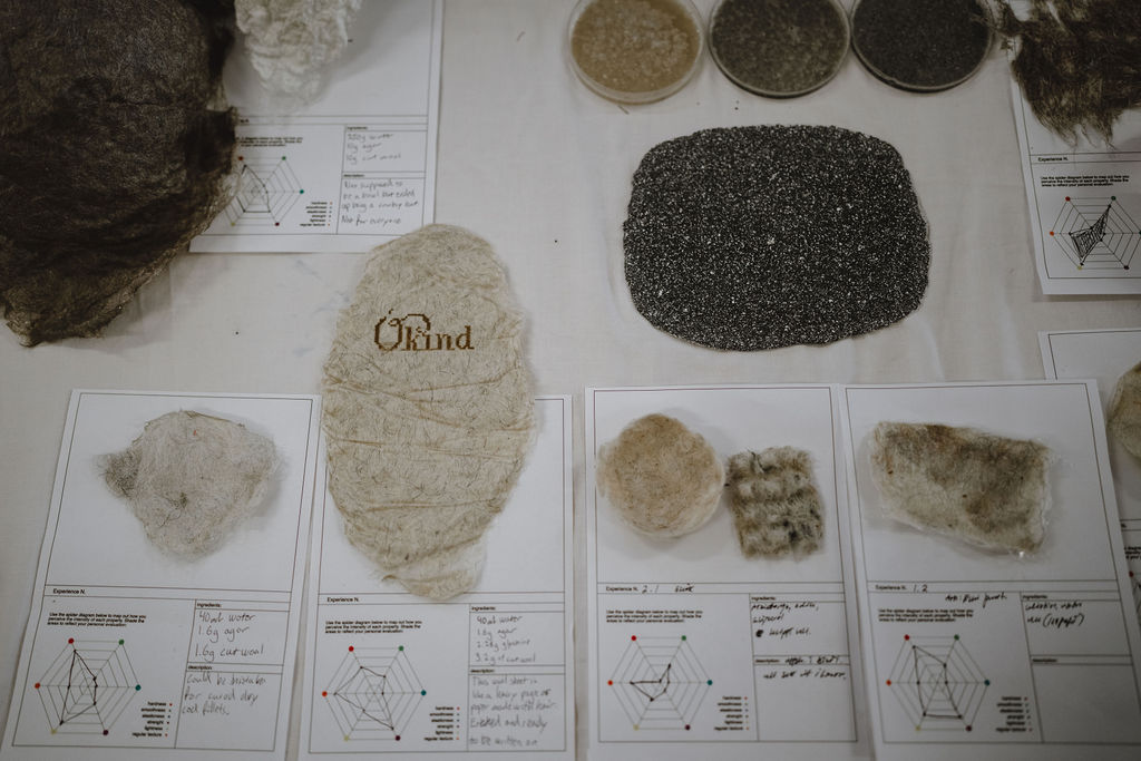 The final selection captured a spectrum of outcomes - from translucent seaweed-based films to sand-filled composites, wool-integrated surfaces, and hybrid textile experiments - each carrying traces of the local territory and the collective process that shaped them.